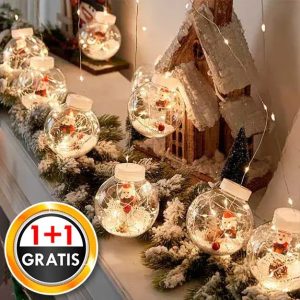 Priehľadné gule obsahujú roztomilé figúrky, umelý sneh, šišky a LED svetlá.