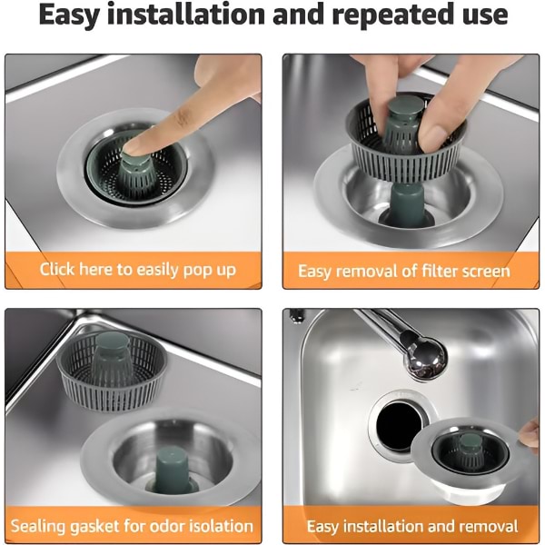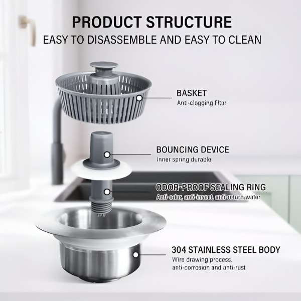Toto riešenie „všetko v jednom“ funguje ako sitko, zátka a filter proti zápachu – udržiava váš drez čistý, suchý a bez zápachu.