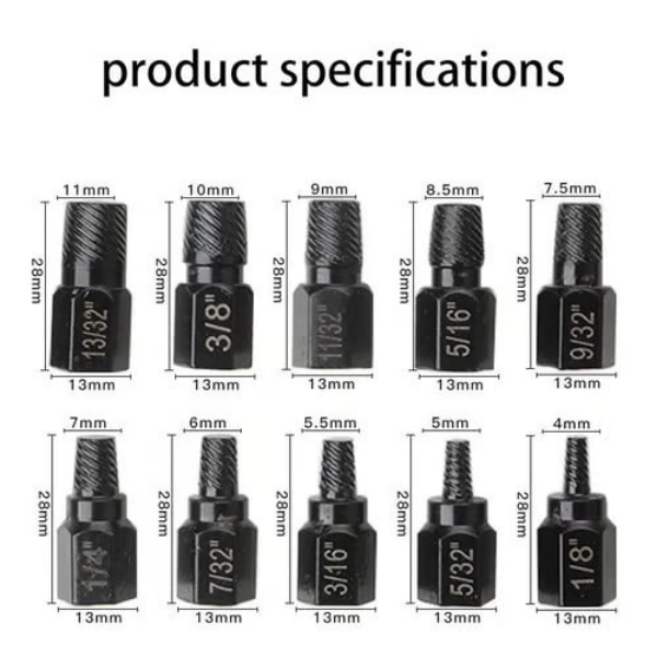 Súprava 10 ks vyťahovačov skrutiek ponúka širokú škálu veľkostí, vďaka čomu budete mať vždy správny nástroj na každú úlohu pri vyťahovaní.